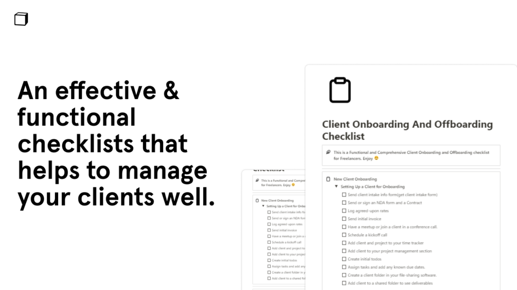 Manage your client's onboarding and offboarding with this functional and effective checklists.